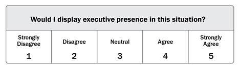 For each of these 10 common scenarios where leaders need to display executive presence, rate with this assessment how well you display executive presence.